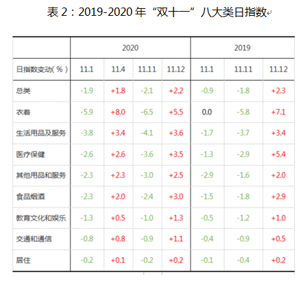 在总类价格折扣力度不大的情况下,我们来细分看看八大类商品在“双十二”期间的价格表现。从下表可以看出,八大类商品在今年12月12日当天的降价幅度都不大,其中医疗保健大类降价最明显(-2.0%),其次是生活用品及服务大类(-1.3%)。其他大类的降价幅度都低于1%,尤其是衣着大类价格没有下降。更大的折扣在12月10日就已经体现出来,以衣着(-2.8%)为首,医疗保健(-1.9%)、生活用品及服务(-1.9%)也降价较大。而在12月13、14日,各大类价格都出现了明显的提高,其中衣着提价最多。这和去年“双十二”的价格表现有所不同:去年“双十二”当天八大类中有七个大类降价,其中衣着类降价幅度最大(-3.3%),然后在12月13日出现了以衣着大类为首(+4.1%)的提价。今年的不同主要表现在三个方面:1)各大类降价时间提前;2)医疗保健、生活用品及服务取代衣着,成为降价最大的大类;3)各大类价格在节后提价幅度显著且时间持续。进一步对比表2中2019-2020年“双十一”期间的价格表现,可见无论从降价的全面性和力度上看,“双十二”都不如“双十一”更优惠。